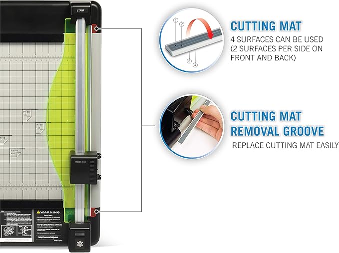 - 12" paper length. Green friendly trimmer cuts cardstock, artist black core mat board, 1/8" foam board and plastics sheets. Contains 100% pre-consumer recycled content.