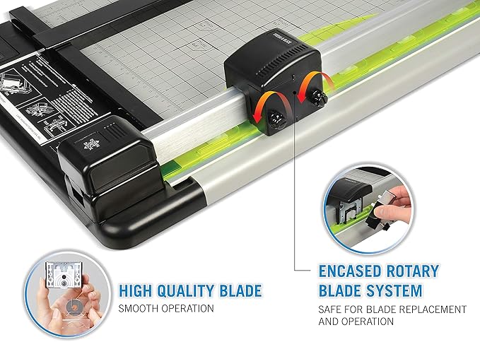 - Patent locking rail mechanism. Features handy storage compartment for extra blades and cutting mats.