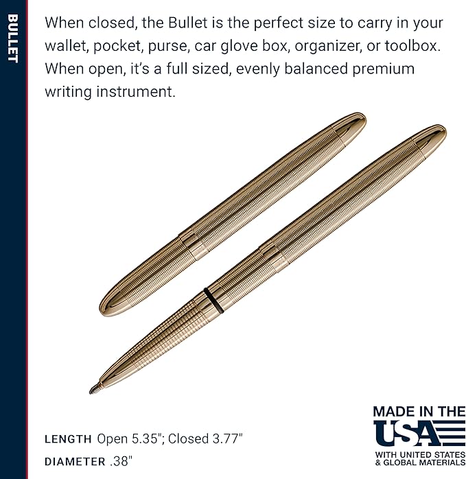 - A Pen Designed to Last: The Brass Bullet Pen is beautifully lacquered brass bullet space pen with machined grooves throughout the body and cap and a durable finish