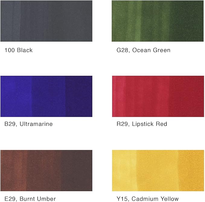 - This 6 piece set focuses on darker-tone primary colors: 100, B29, E29, G28, R29, and Y15. A great companion to the Perfect Primaries set and is a must for your Copic marker collection.