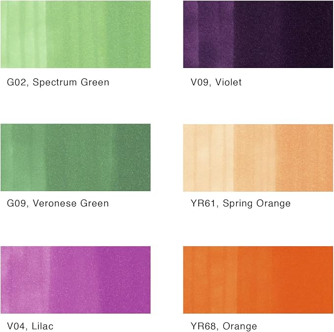 - This 6 piece set includes mid-tone and dark values of the secondary colors: G02, G09, V04, V09, YR61, and YR68. The perfect companion to the bold primaries set.