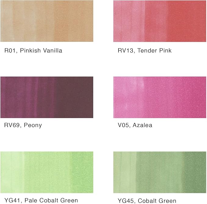 - This 6 piece set includes rosy colors with a splash of yellow-green: R01, RV13, RV69, V05, YG41, and YG45. A great way to begin adding floral colors to your Copic collection.