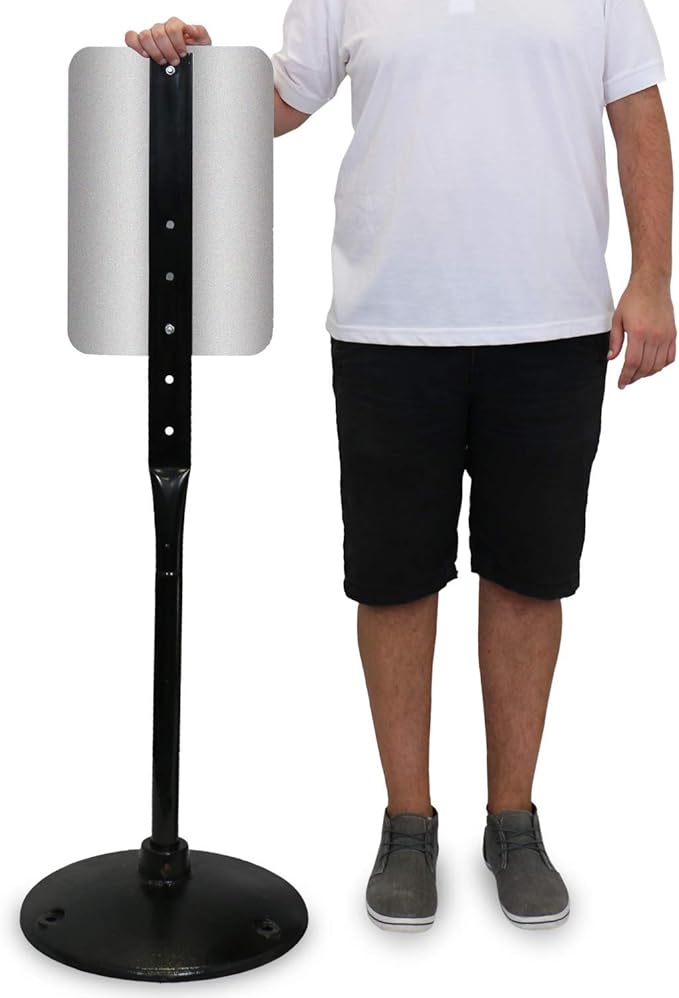 - DURABLE. Sign base is made of solid cast iron and is sturdy enough to resist abuse such as bumps, dings or dents from vehicular impacts. Sign base is difficult to tip over, even in stormy weather with high winds, making it great for busy parking areas.