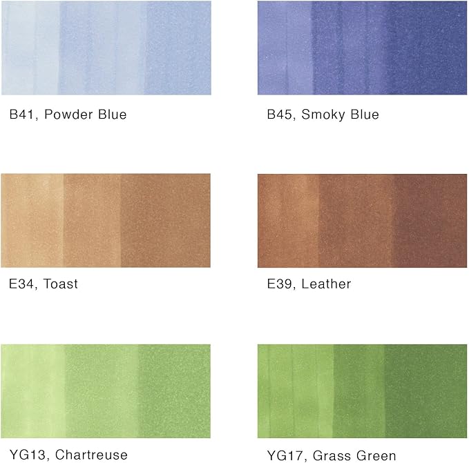 - This 6 piece set includes curated colors of the earth, blues, browns, and yellow-greens: B41, B45, E34, E39, YG13 and YG17. A great companion to the Sea & Sky set.