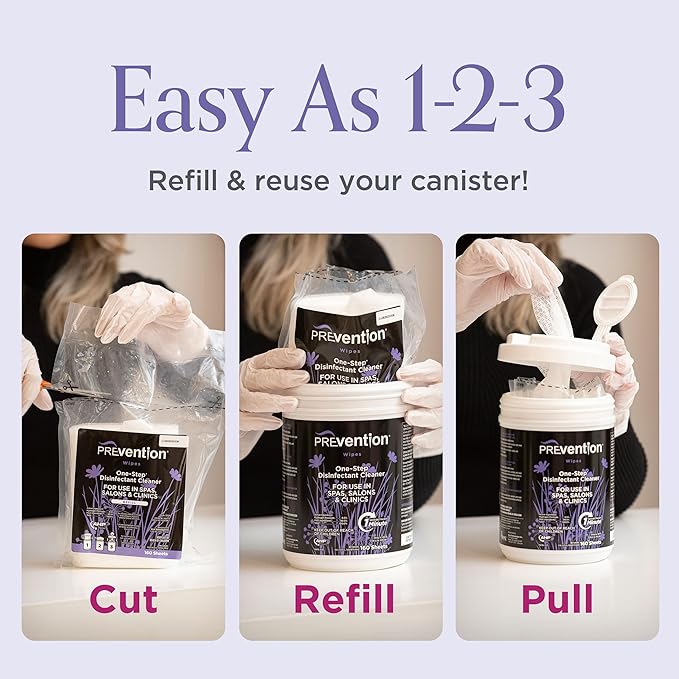 - Disinfectant Wipes Bulk – Convenient and eco-friendly, Prevention Disinfectant Refill Wipes reduce plastic waste by 90%, when compared to regular canisters. Simply reuse your existing canister and refill with the disinfectant wipes you trust. The compact size of refill wipes takes up less room in your spa or salon making them also cost effective.