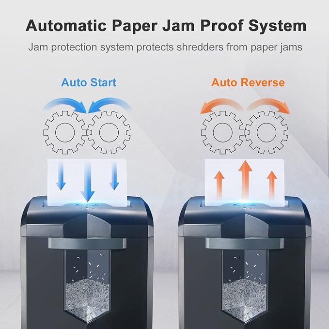 - Auto Start & Reverse: Auto start/stop and auto-reverse function protect you from the frustration of paper jams; overheating and overloading protection technology keeps sustainable using and prolong shredder's lifetime. Press the power switch, you only need to put the paper into the entrance of the shredder and it will work automatically.