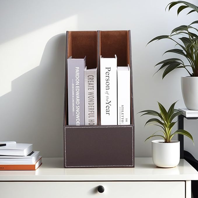 KINGFOM Wooden Leatherette Desktop File Folder Organizer and Document File Stand Journals Magazine Rack 2 Slots (brown)