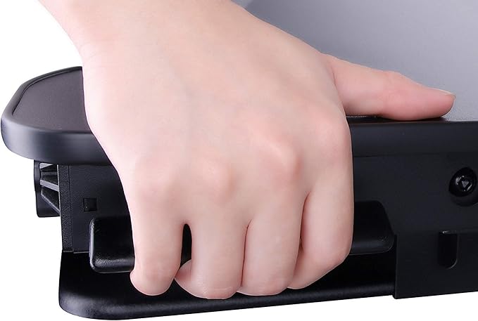 - Sliding ergonomic keyboard tray - extends, retracts and locks in place while keeping a 4.5" spacing between keyboard tray and desktop, which helps keep arms and wrists in a comfortable position to prevent neck and back strain while sitting or standing.