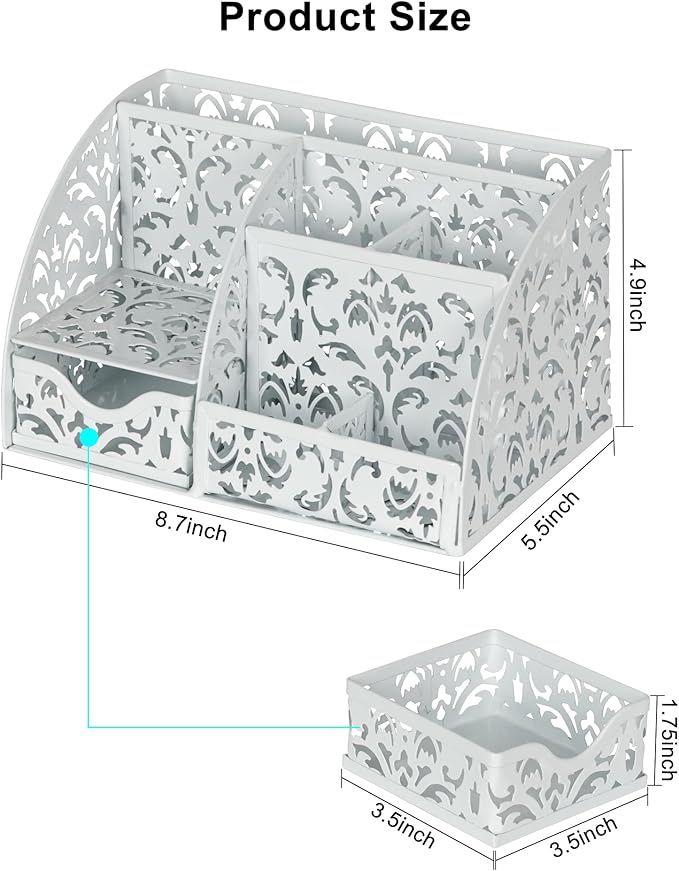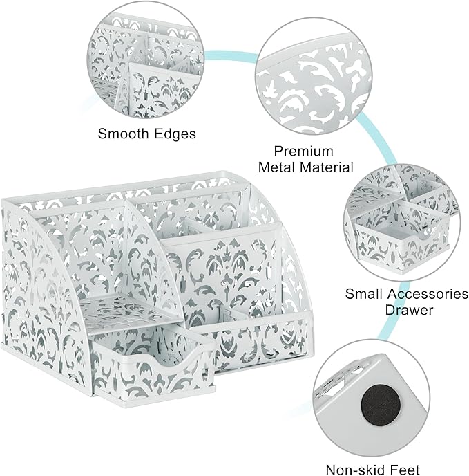 - Premium Metal Build: Made of metal with hollow flower patterns and anti-rust powder finished, this desk caddy combines elegance with functionality. Smoothed edges and a chip-resistant coating ensure long-lasting beauty.