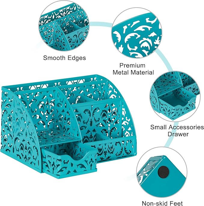 - Premium Metal Build: Made of metal with hollow flower patterns and anti-rust powder finished, this desk caddy combines elegance with functionality. Smoothed edges and a chip-resistant coating ensure long-lasting beauty.