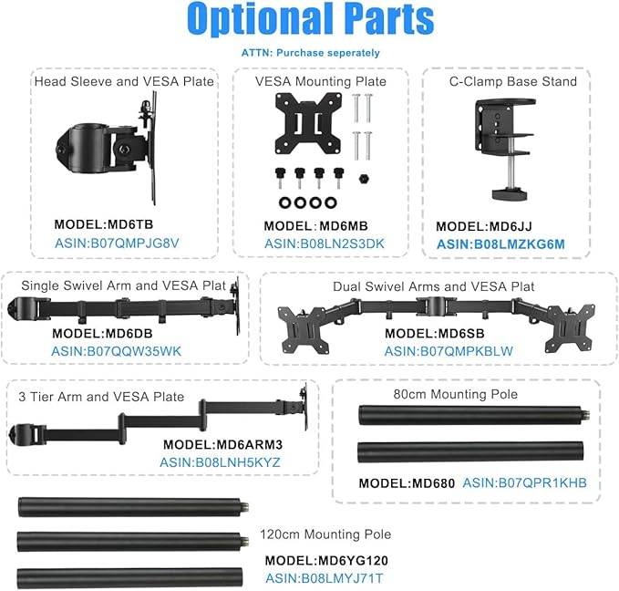 - Fully aticulation - Rotate 360°, tilt ±90° up and down, swivel ±90° left and right, height adjustment along the center pole.