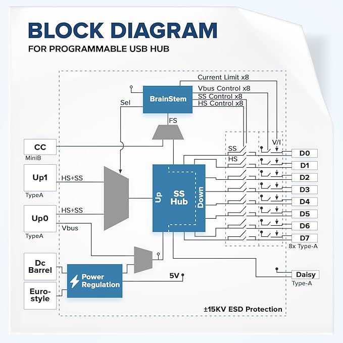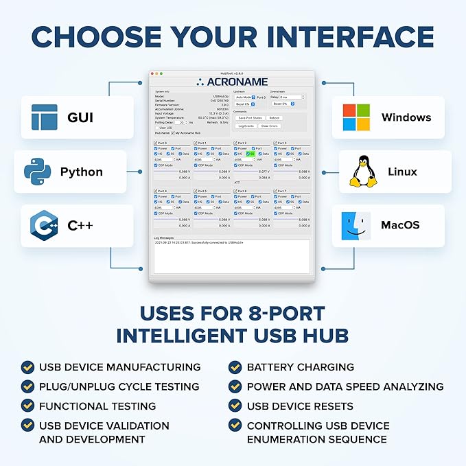- [Managed Solution] - Programmable industrial grade USB hub, 9 downstream, 2 upstream ports individually control and measure port voltage, current and data transfer