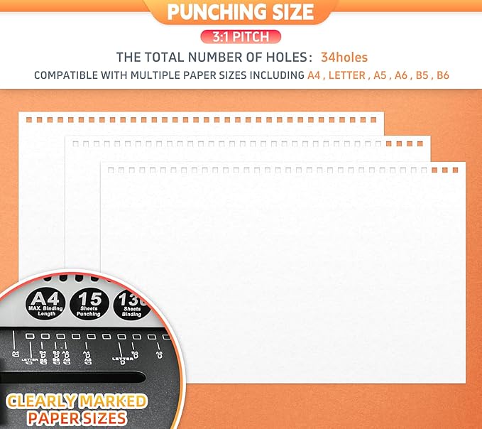 - 【Large Binding Capacity】Capable of binding up to 130 sheets of 80/20lb gsm paper with 5/8inch wire binding spines, this machine can punch through up to 15 sheets of A4 paper in one go. It also handles two sheets of plastic binding covers (0.2mm) or leathergrain binding covers (230gsm) effortlessly.