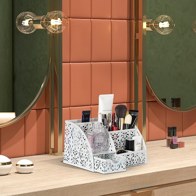 - Premium Metal Build: Made of metal with hollow flower patterns and anti-rust powder finished, this desk caddy combines elegance with functionality. Smoothed edges and a chip-resistant coating ensure long-lasting beauty.