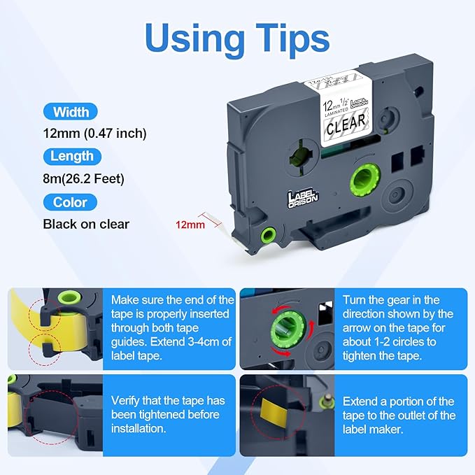 - Color & Dimension: Black on clear laminated label cartridge, 1/2 inch (12mm) width x 26.2 feet (8m)length, long lasting. 100% compatible for brother printers and no jam up your printers.