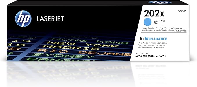 - What's in the box: 1 new Original HP 202X Cyan High-yield Toner Cartridge (CF501X)