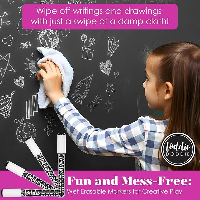 - Loddie Doddie Trust: Count on the Loddie Doddie white liquid chalk marker pack, which is non-toxic and odor-free, to make your art pop without any dust drama. Perfect for use as glass markers erasable and on chalkboards, this white chalkboard marker pack is essential for all your holiday art and home decor projects
