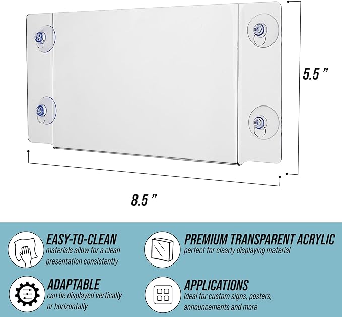 - Conveniently Sized: This window sign holder with suction cups is ideal for posting store hours, events, or sales. Its 5.5" x 8.5" size fits glass doors and windows, making it a versatile option for retailers, offices, and restaurants.