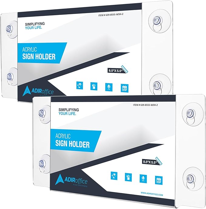 Adir Acrylic Sign Holder – Window Sign Holder with Suction Cups for Advertising and Promotion, Wall-Mount Display Frame, Clear Sign Holder Stand for Glass, Mall, Restaurants, Office - 2 Pack (8.5x5.5 Inch)