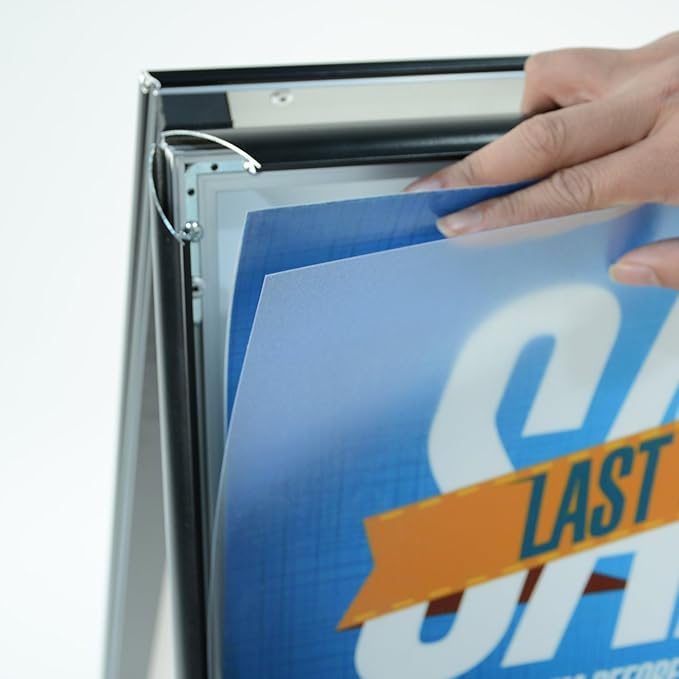 - Heavy Duty: This folding sandwich board with dry erase signs is made from durable metal. It's easy to use - just snap open the front and change the picture without needed to take the frame down!