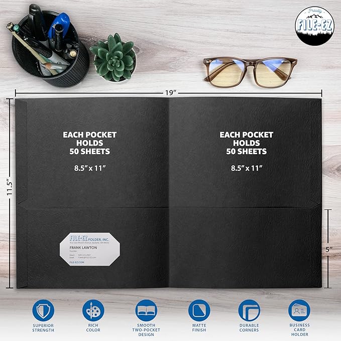 - PACKAGE INCLUDES: Your selected PACK SIZE and COLOR of Two-Pocket Folders constructed using Textured Paper, Matte Finish, Supports Letter Sheet Size (8 1/2" x 11")