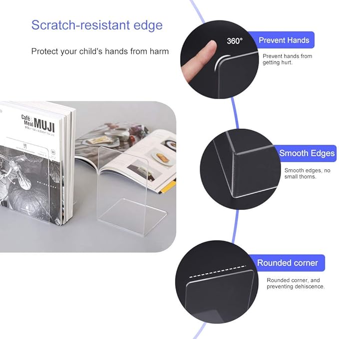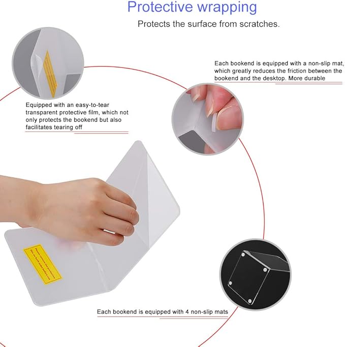 - Crystal-Clear and Scratch-Free – The clear bookends allow easy visibility of book titles while keeping your collection dust-free and organized. Smooth, rounded edges prevent scratches on books or surfaces.