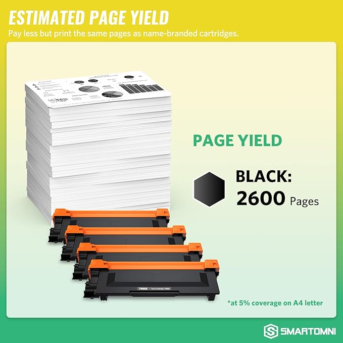 - Estimated Page Yield: Per TN660 toner can print 2600 pages at 5% coverage of letter/A4 as usual.
