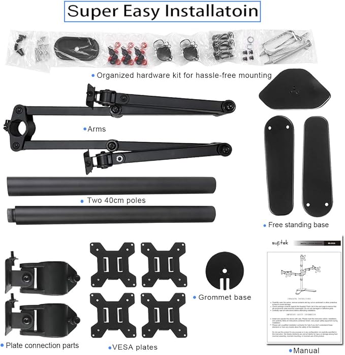 - Two install options - Free standing base let you easily move your monitors to anywhere. Optional grommet base (fits desk up to 4" thickness) save your valuable desk space.