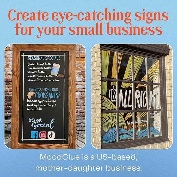 - š„ GREAT FOR OFFICE / STORE / RESTAURANT / HOME / SCHOOL - Use MoodClue's fun, bright markers on glass, mirrors, windows, glassboards, whiteboards, bistro boards, most blackboards, stainless steel, sealed tiles and stone, and more. These liquid chalk markers erase easily from non-porous surfaces. Brighten up your day and make your point.