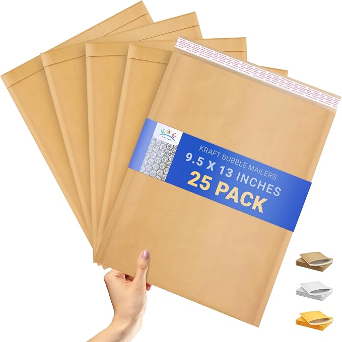 - Pack of 25 Kraft Paper Mailers, 9.5 x 13 Inches. Bubble shipping envelopes combine the strength of kraft paper with the protective soft bubble lining, all wrapped up in a sleek and minimalist brown kraft design.