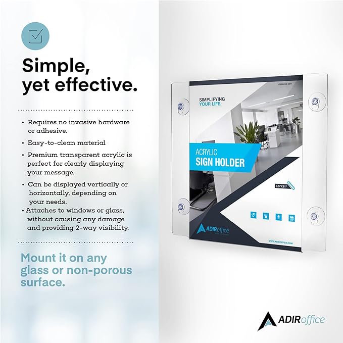 Adir Acrylic Sign Holder – Window Sign Holder with Suction Cups for Advertising and Promotion, Wall-Mount Display Frame, Clear Sign Holder Stand for Glass, Mall, Restaurants, Office - 6 Pack (8.5x11 Inch)