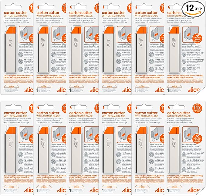 Slice Manual Carton Cutter | Safe Ceramic Box Cutter | Lasts 11x Longer than Metal | Single Edge Razor Blade | Mini Box Cutter | 12 Pack