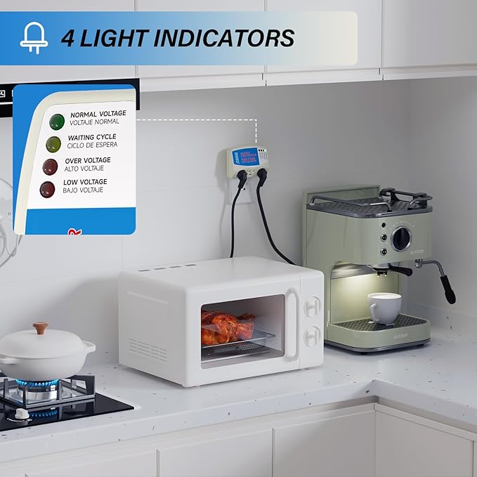 - 4 Led Indicators: Light indicators for Normal Voltage, Over Voltage, Low Voltage and Waiting Cycle. 4 Mode Led Indicator can let you know the power status of your home appliances in a simple and clear way. Directly Plug In Design—Easy to use.