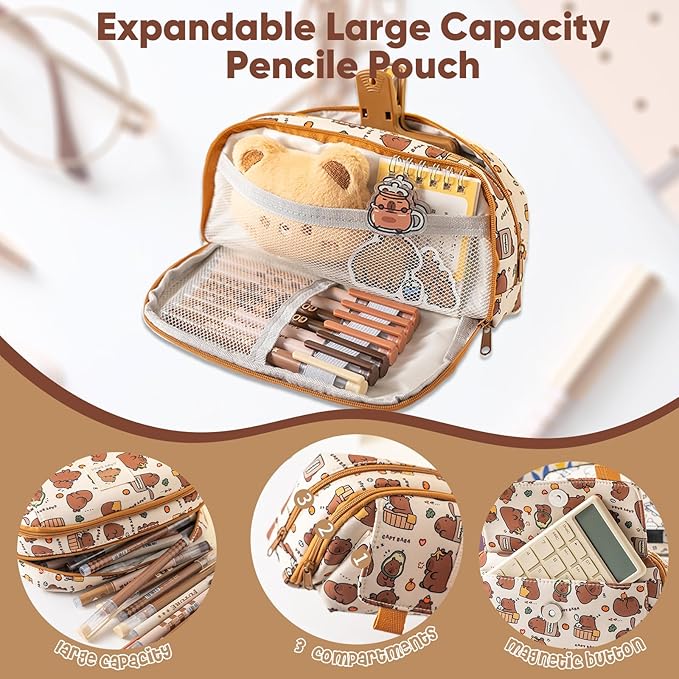 - TRENDY CAPYBARA DESIGN: Meet the Capybara—the global trend icon loved for its calm, friendly vibe and irresistibly cute look. This stationery set brings that same relaxing energy to school life, with winking and smiling capybaras that spark joy and ease stress. Featuring a soft yet durable pencil case and matching supplies, it adds a playful, healing touch to any desk or backpack. Practical, stylish, and heart-meltingly cute—it’s the perfect choice for capybara fans and kids who love kawaii essentials.