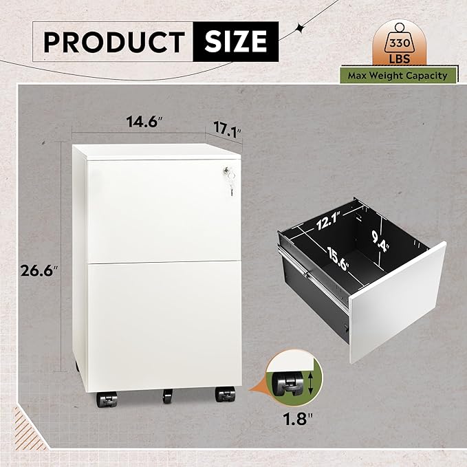 - Sturdy Metal Construction:Crafted from cold-rolled steel with a durable powder coat finish, this file cabinet is scratch and stain resistant. It supports up to 330 pounds, ensuring reliable long-term use.