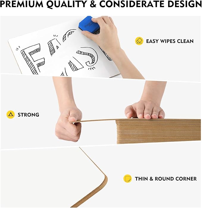 - 【QUALITY & SAFETY MATERIALS】 Our dry erase boards are made of Sturdy hardboard, which is very durable. The mini white board dry erase and all accessories are non-toxic. The user-friendly rounded corner design can prevent your child injured when exerting creativity.