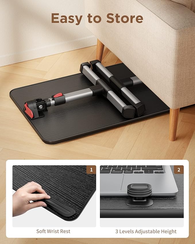 - Ergonomic Design Bed Desk - Soft wrist rest pad provides your wrist a comfortable place. The retractable blocker protects your computer from falling down. 5 adjustable heights(9.4"-12.6") and 4 adjustable angles (0-36°) provide you a more comfortable posture and avoid back & neck pain.