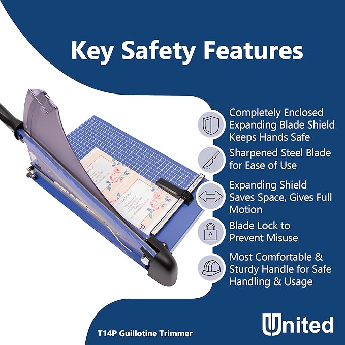 - SAFE: Full-length safety shield guard protects hands from the paper slicer blade in any position. The solid steel paper trimmer blade arm with ergonomic handle provides comfortable control and accurate cuts. Safely secure the guillotine cutter blade with the built-in blade lock when not in use.
