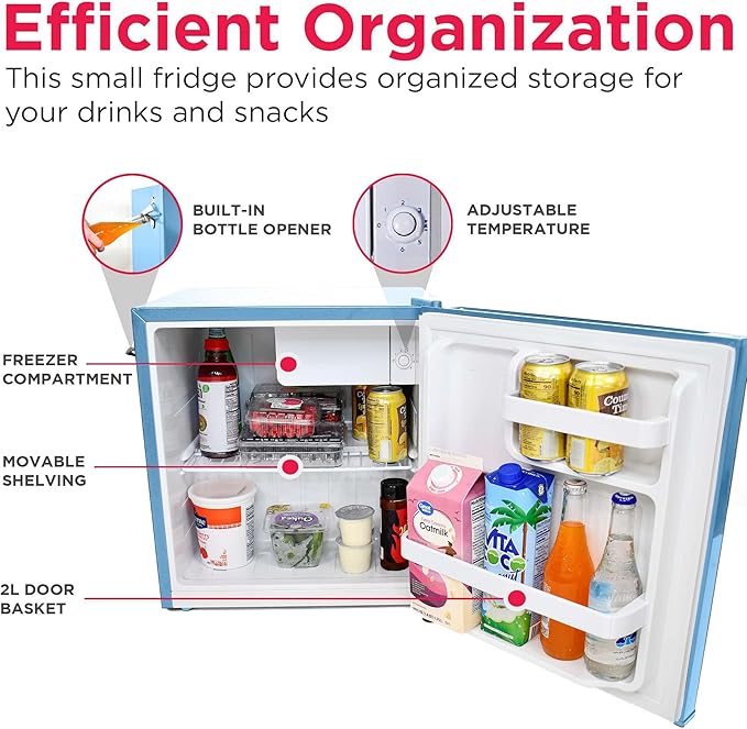 - PRACTICAL STYLE: Perfect for entertaining, this small retro fridge comes with a built-in bottle opener on the side, along with an easy-open pull handle that adds to the retro vibe and is reminiscent of classic designs from the past.