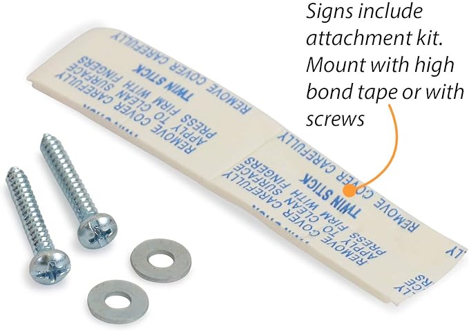 - EASY TO INSTALL. Signs have a flange with pre-drilled holes for easy installation. Projecting signs come with mounting kit for fast installation. All signs include screws and adhesive tape.