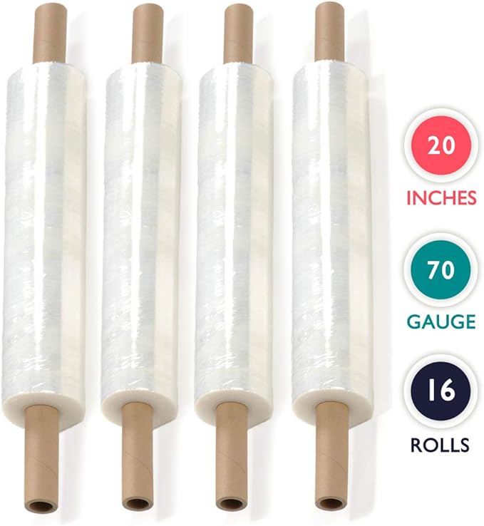 - PROTECTION DURING TRANSIT: 20 inch stretch film can be applied by hand to secure loads onto pallets keeping the contents safe and contained while moving pallets around warehouses, enabling easier and safer loading, delivering and storage. 16 Rolls Stretch Shrink film is ideal for wrapping and protecting goods while in transit.