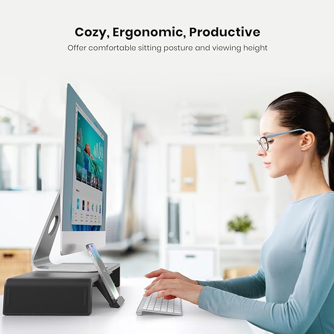 - 【Ergonomic Monitor Riser for Desk】Klearlook computer monitor stand for desk raises your monitor to just-right height, reducing strain on your back and neck during working. Sitting at correct posture makes working more productive.