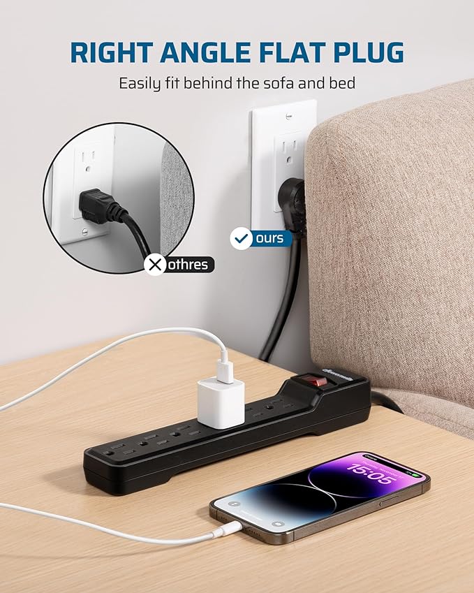 - 【 Low Profile Flat Wall Plug 】Right angle flat plug allows furniture to be pushed against the wall; the slim design is ideal for tight spaces behind TV bracket, sofa, nightstand, and headboard