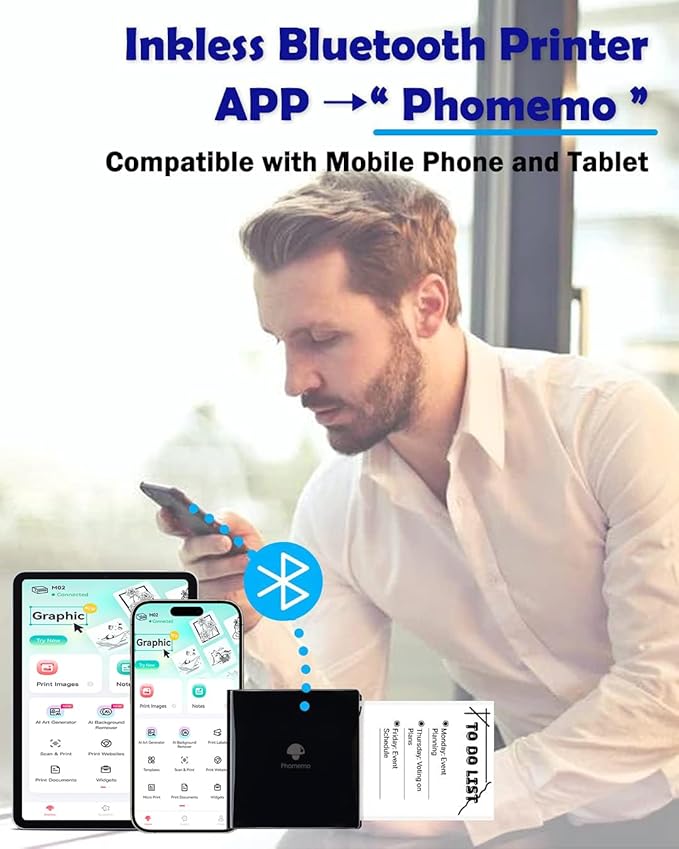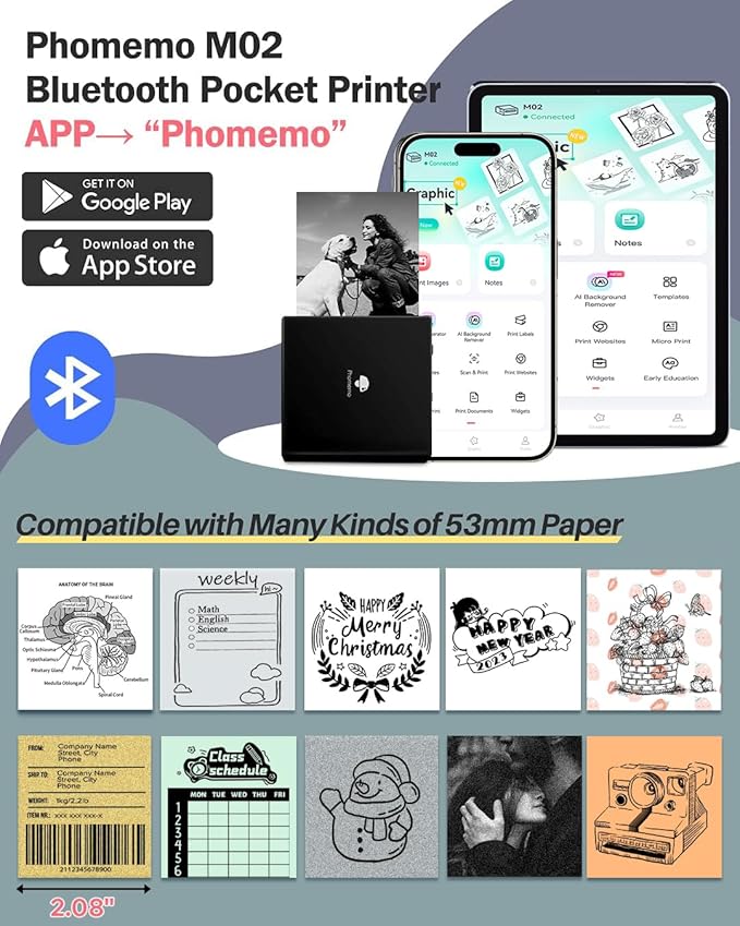 - Bluetooth Thermal Printer- Bluetooth 4.0 connection. System for Android 7.0 and iOS 13.0 or above. Phomemo M02 pocket printer is an inkless printer, you donโt need to buy any ink or toner. Portable mini printer help you save time
