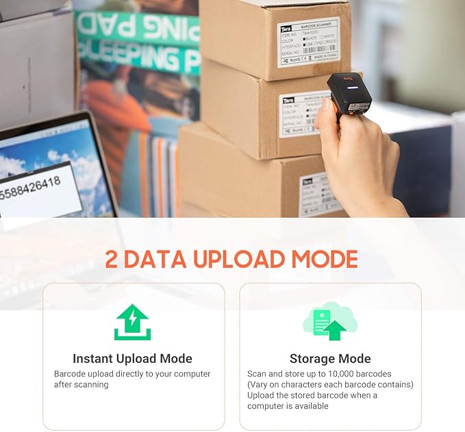 - Two upload mode: Instant upload mode + Storage mode. Scan and store up to 50000 barcodes in the built-in storage of the scanner, and then upload all the stored data to your device when you need.