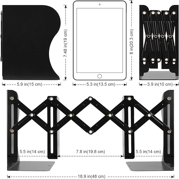 - Size: 3.9-18.9 inch x 5.9 inch x 7.5 inch, the adjustable bookend can be expand to 18.9 inch and contract to 3.9 inch to meet various needs, you can easily remove one item without dislocating the others.