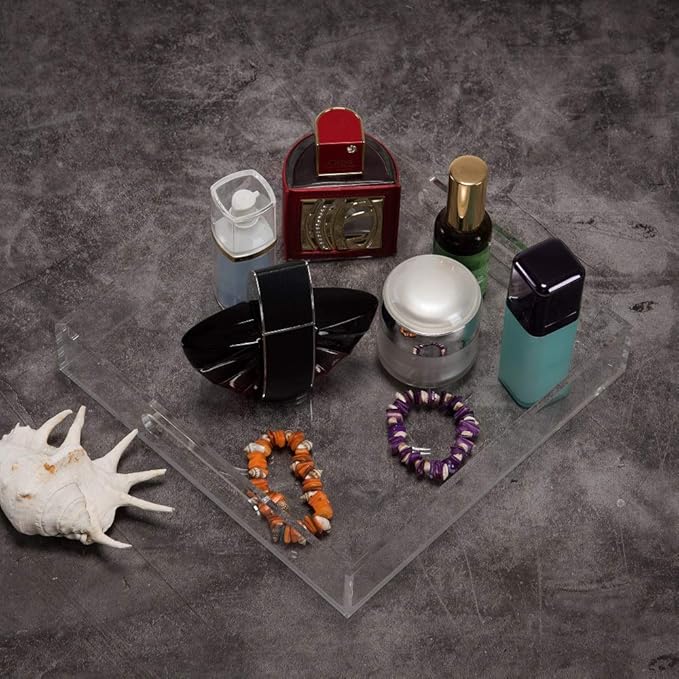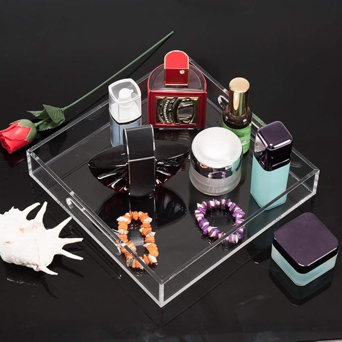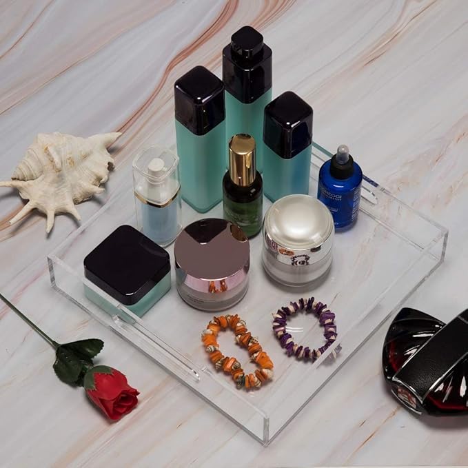 Clear Sturdy Acrylic Serving Tray with Handles - 10x10Inch - Coffee, Appetizer, Breakfast, Butler Tray - Kitchen Countertop & Vanity Table Organizer