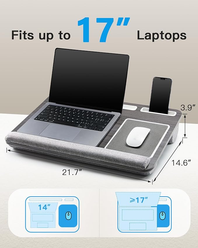 - CONVENIENT FEATURES: The laptop desk features a tablet holder and phone holder so you can keep your devices in one place. The desktop measures 21.65” x 14.57” and is big enough to fit a 17” laptop. Integrated mouse pad is positioned to the right with enough room for a 14” laptop to be place on the left side when in use.