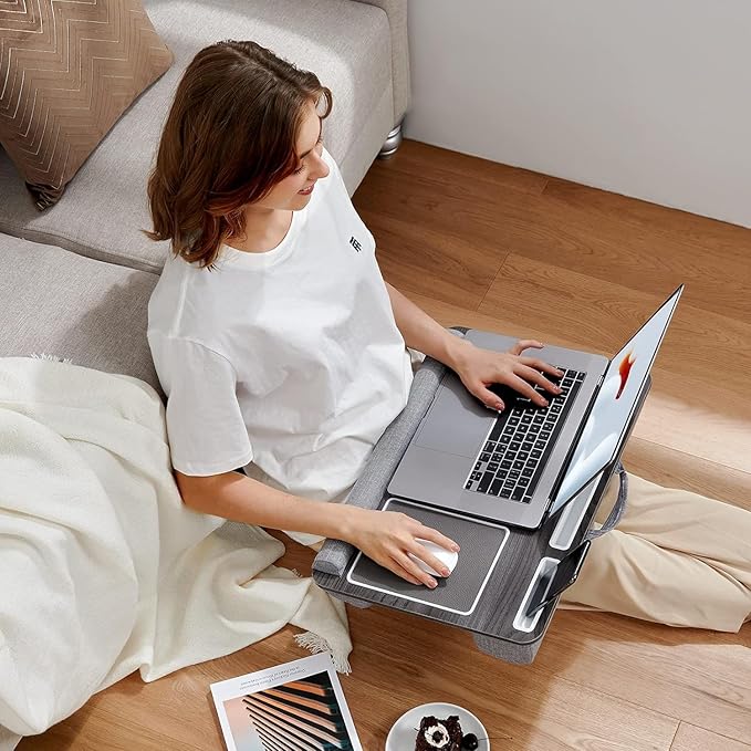 - PORTABLE & LIGHTWEIGHT: This laptop lap desk is designed with a handle that makes it easy to carry and only weighs 4.3lbs. Take the lap desk with you to the coffee house, library, airport, or office for an improved work experience.