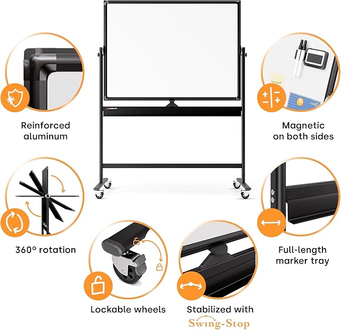 - Easy to Move and Adjust: Our mobile whiteboards feature Swing-Stop wheels and an easel frame that can be locked in place to maximize stability. The double-sided easel stand can easily flip to maximize whiteboard space and the dry erase boards feature magnetic surfaces, which allow you to easily organize accessories.